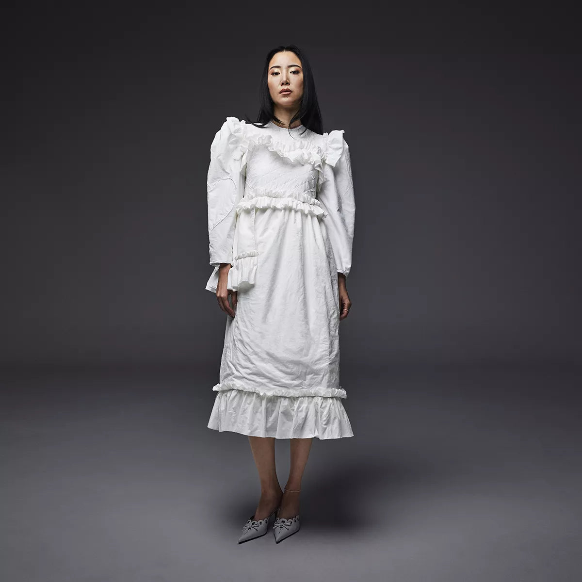 ALEX S. YU cites the use of unconventional materials — in this case Cashmere BT — as being “very Martin Margiela.” Alex’s contrasting textures, a beautiful mix of quilted, pleated and ruched material, are equally as Margiela-esque. Yu’s own staple design cues are not forgotten, with an unmistakable shirtdress and a girly, ruffled skirt at the core of his #Cashmere19 design.Â